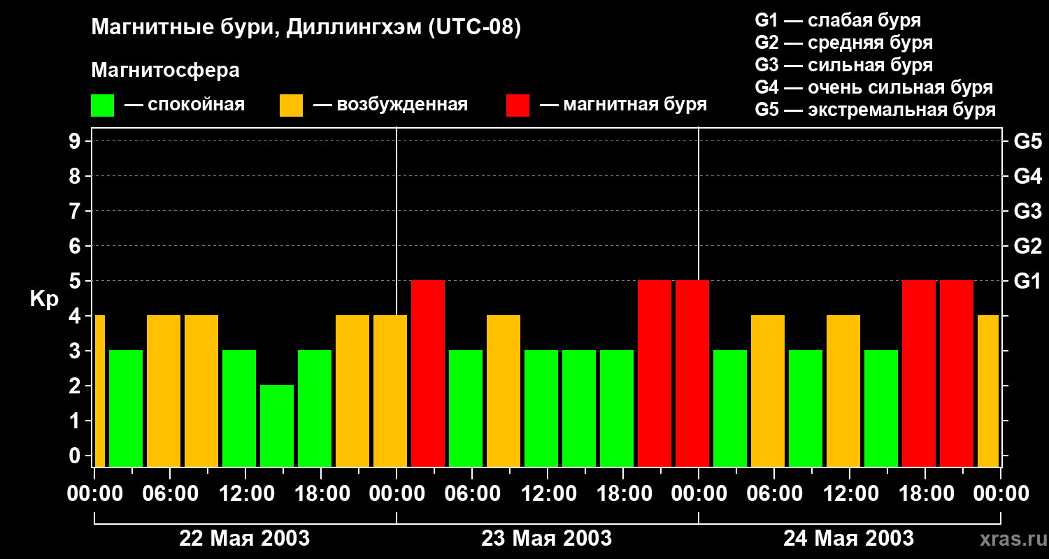 Изменения геомагнитного индекса Kp с 22 по 24 мая 2003 года для средних широт