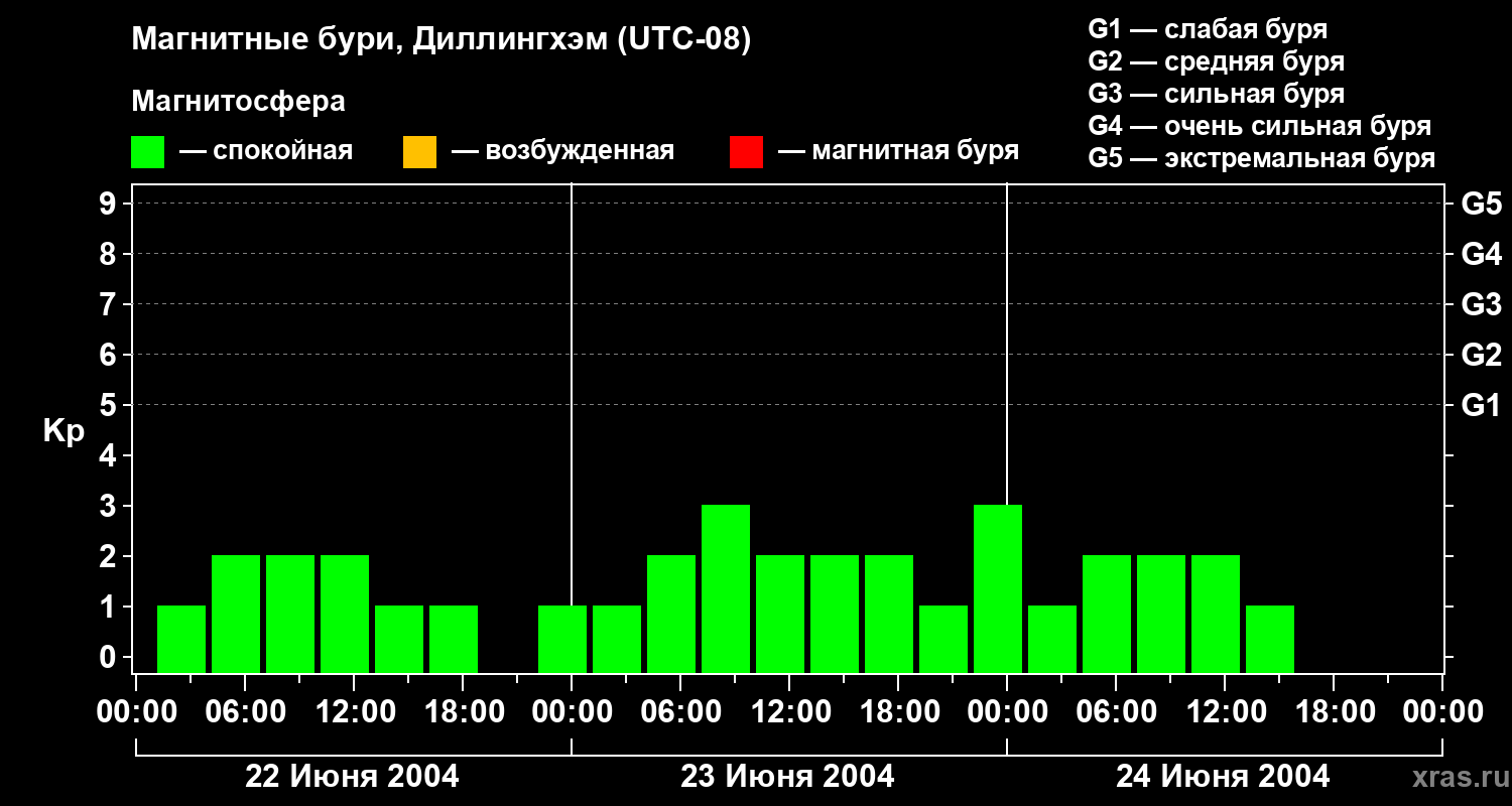 Изменения геомагнитного индекса Kp с 22 по 24 июня 2004 года для средних широт