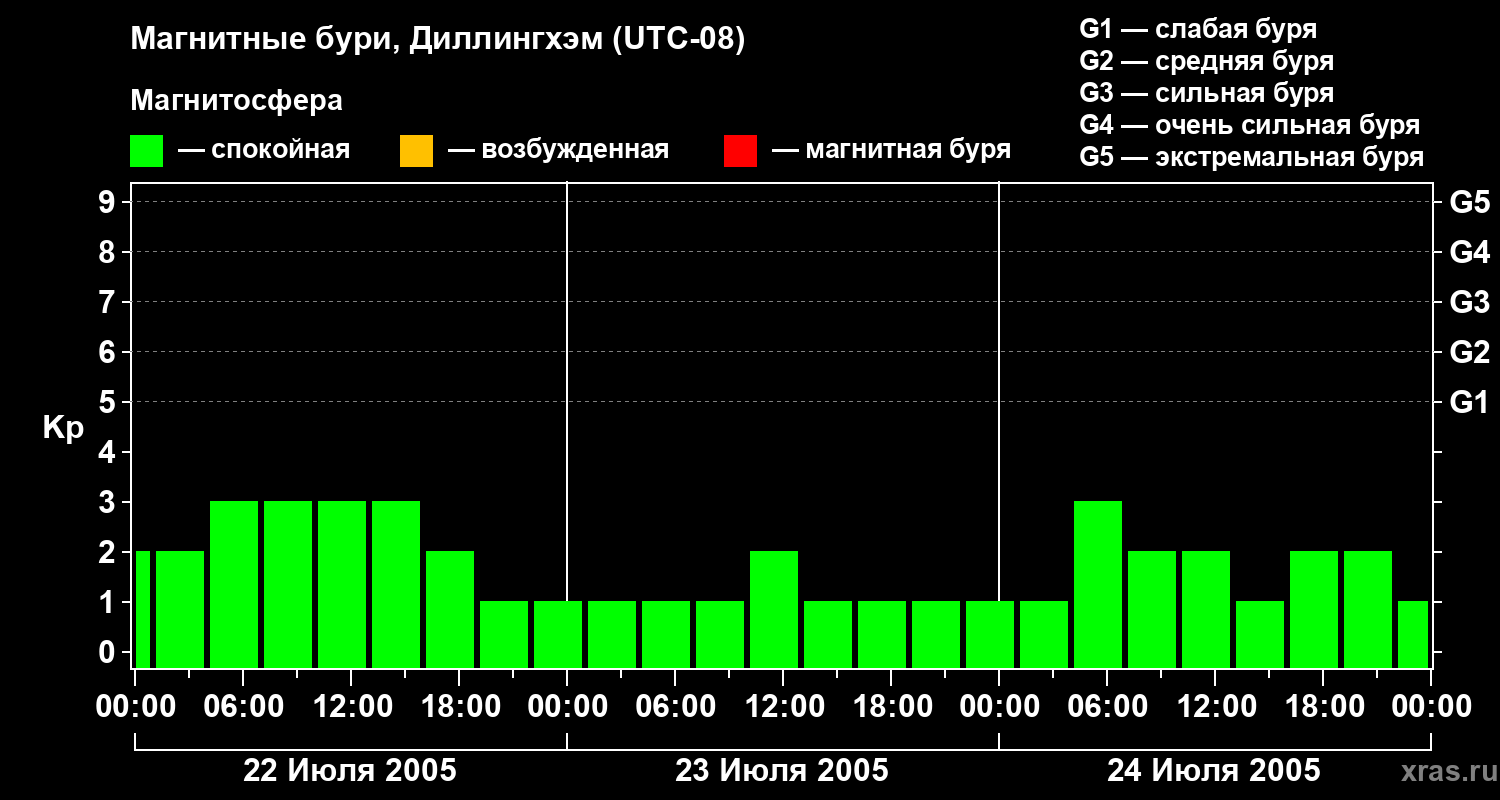 Изменения геомагнитного индекса Kp с 22 по 24 июля 2005 года для средних широт