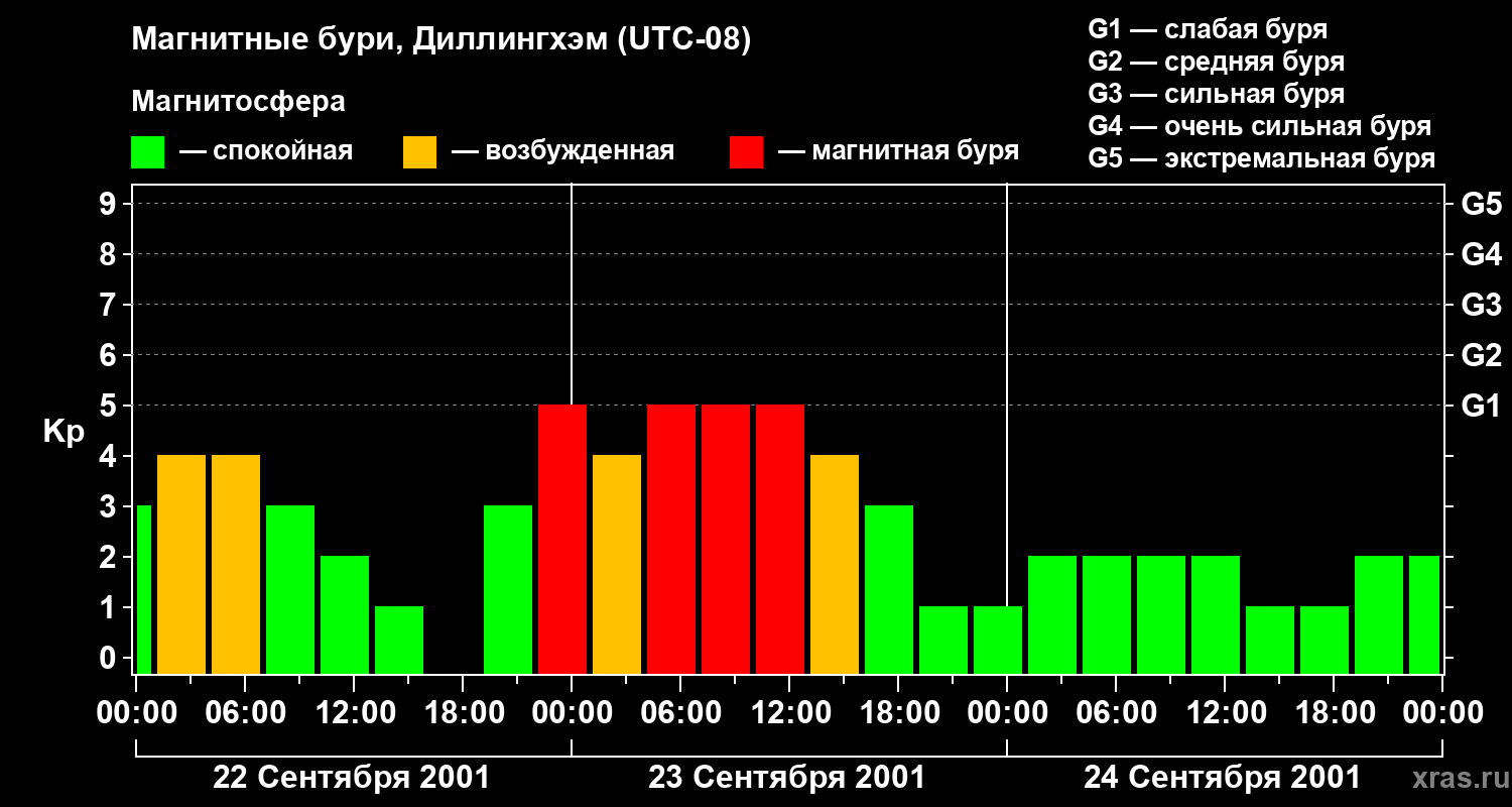 Изменения геомагнитного индекса Kp с 22 по 24 сентября 2001 года для средних широт