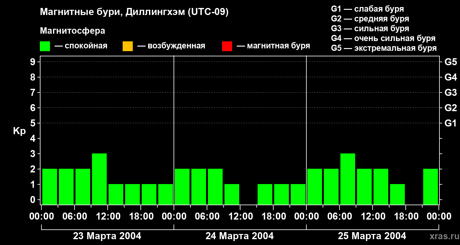 Изменения геомагнитного индекса Kp с 23 по 25 марта 2004 года для средних широт