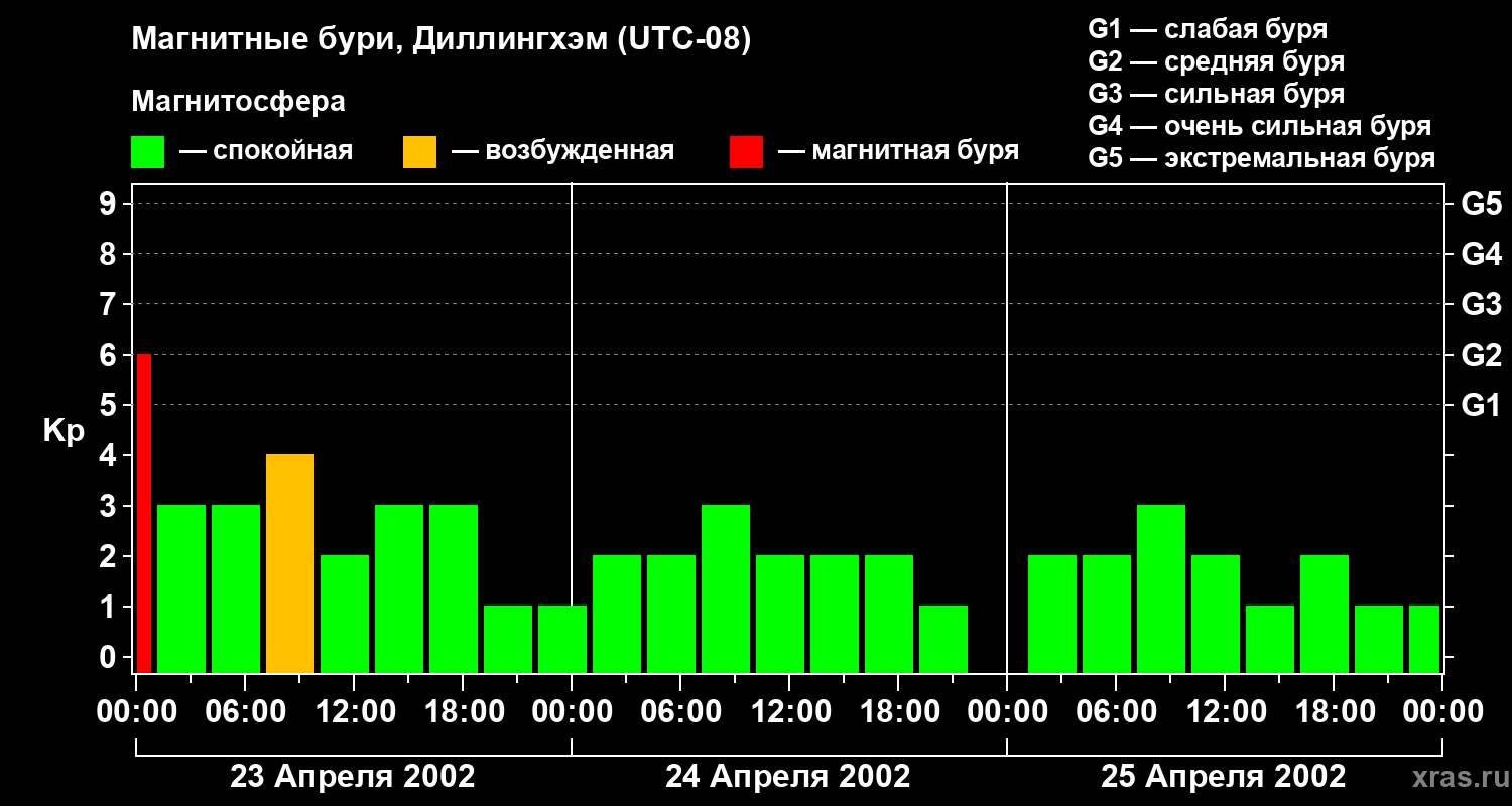 Изменения геомагнитного индекса Kp с 23 по 25 апреля 2002 года для средних широт