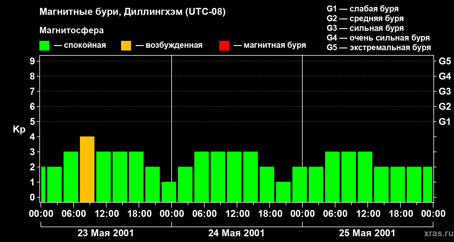 Изменения геомагнитного индекса Kp с 23 по 25 мая 2001 года для средних широт