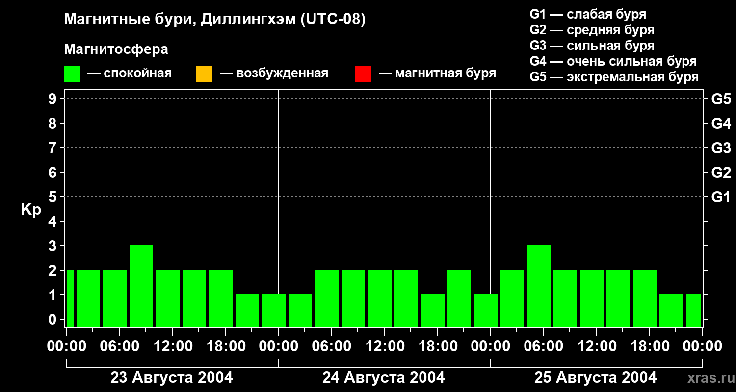 Изменения геомагнитного индекса Kp с 23 по 25 августа 2004 года для средних широт