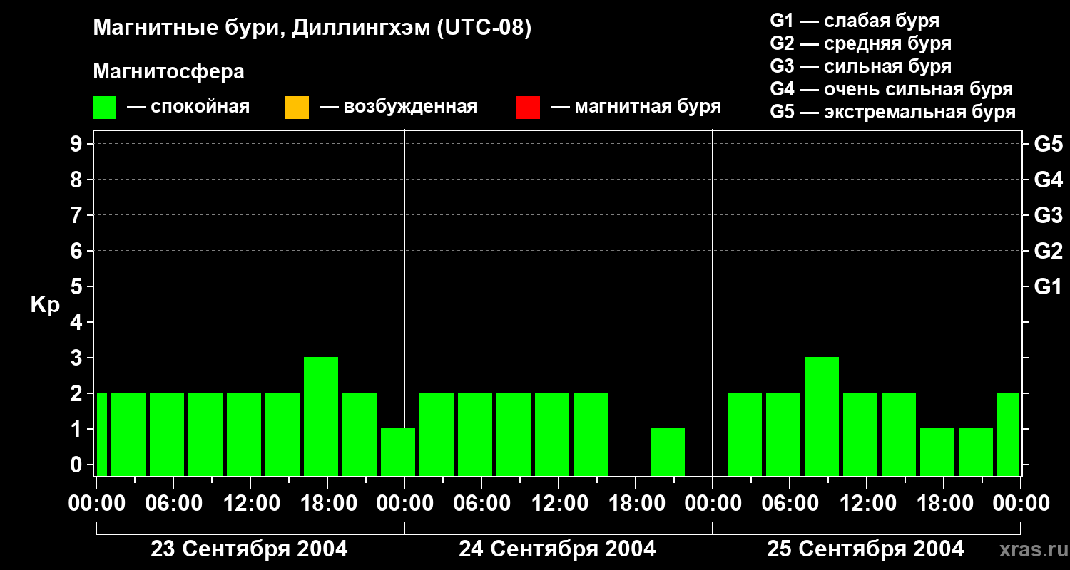 Изменения геомагнитного индекса Kp с 23 по 25 сентября 2004 года для средних широт