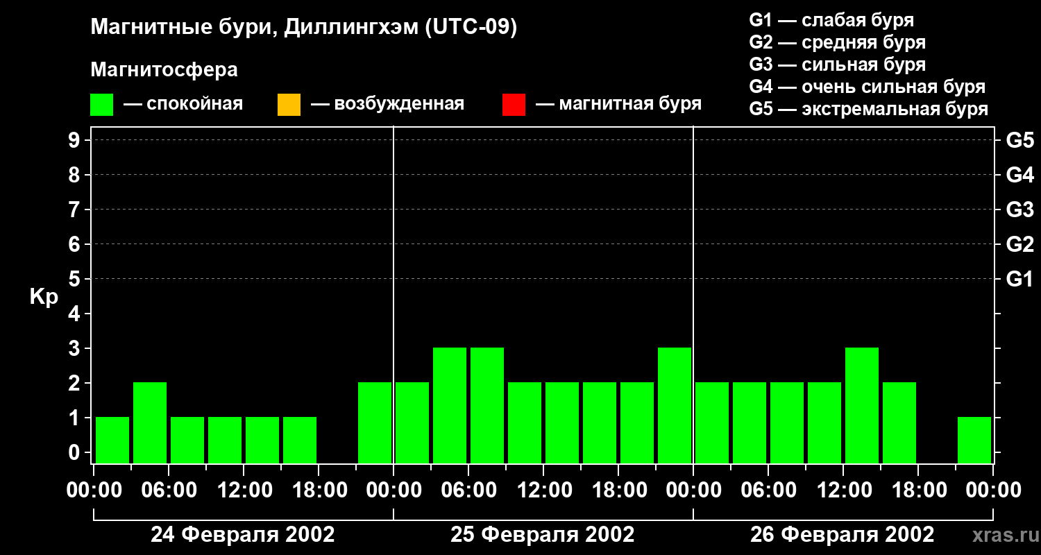 Изменения геомагнитного индекса Kp с 24 по 26 февраля 2002 года для средних широт