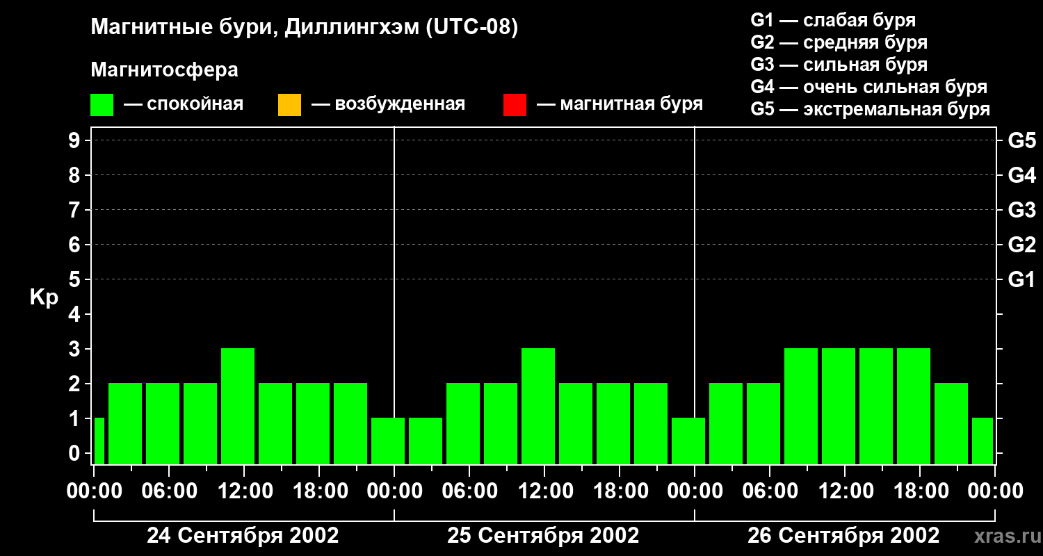 Изменения геомагнитного индекса Kp с 24 по 26 сентября 2002 года для средних широт
