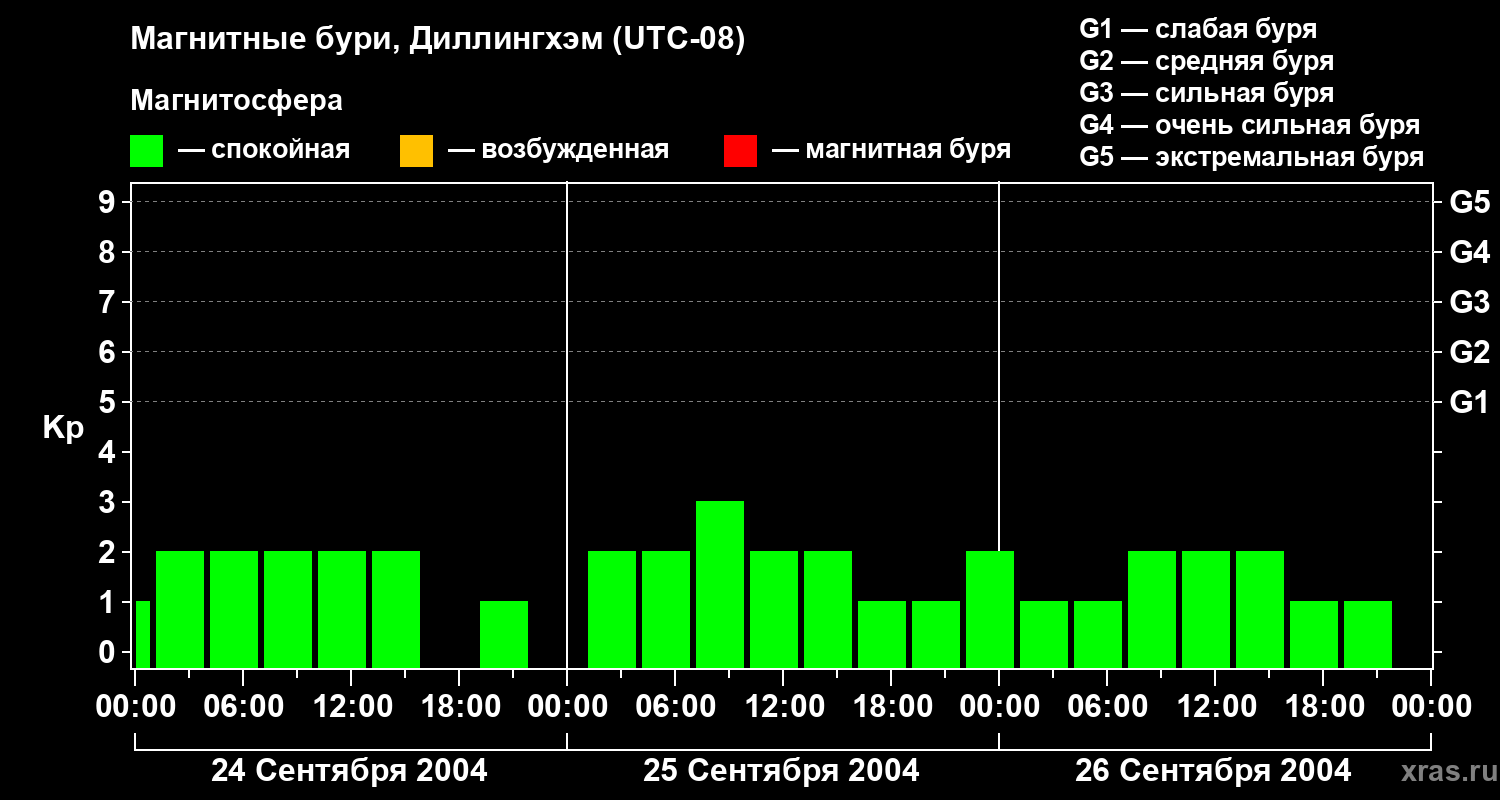 Изменения геомагнитного индекса Kp с 24 по 26 сентября 2004 года для средних широт