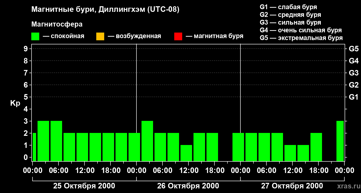 Изменения геомагнитного индекса Kp с 25 по 27 октября 2000 года для средних широт