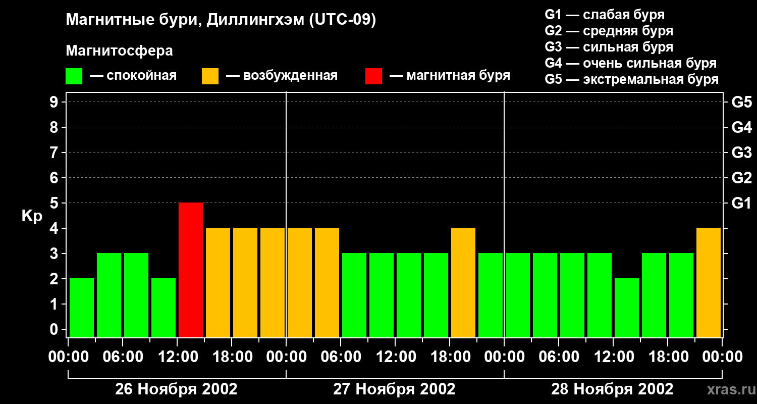 Изменения геомагнитного индекса Kp с 26 по 28 ноября 2002 года для средних широт