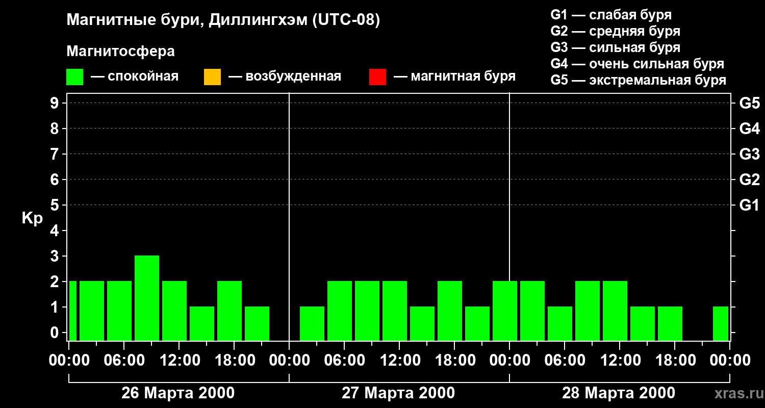 Изменения геомагнитного индекса Kp с 26 по 28 марта 2000 года для средних широт