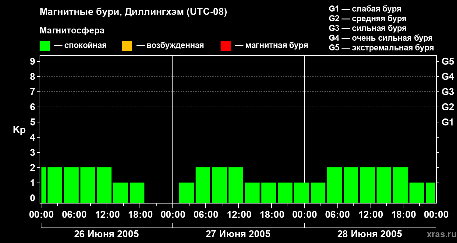 Изменения геомагнитного индекса Kp с 26 по 28 июня 2005 года для средних широт