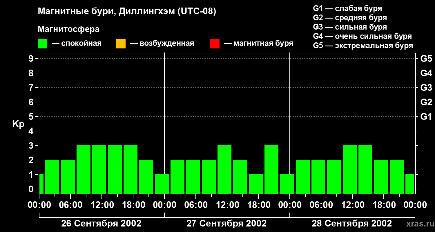 Изменения геомагнитного индекса Kp с 26 по 28 сентября 2002 года для средних широт