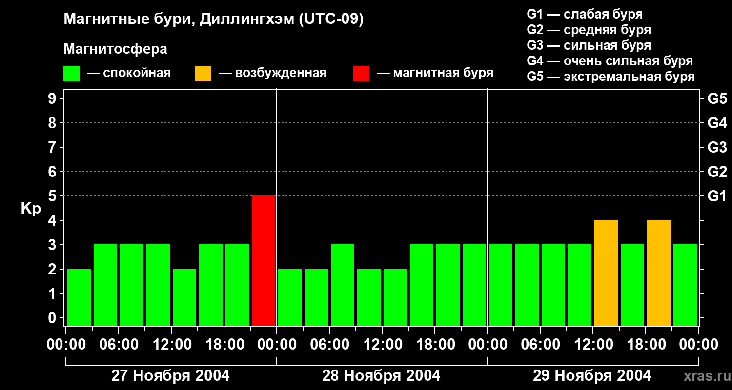 Изменения геомагнитного индекса Kp с 27 по 29 ноября 2004 года для средних широт