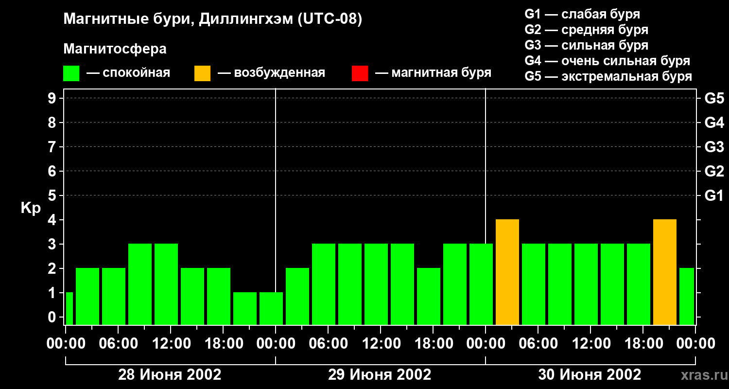 Изменения геомагнитного индекса Kp с 28 по 30 июня 2002 года для средних широт
