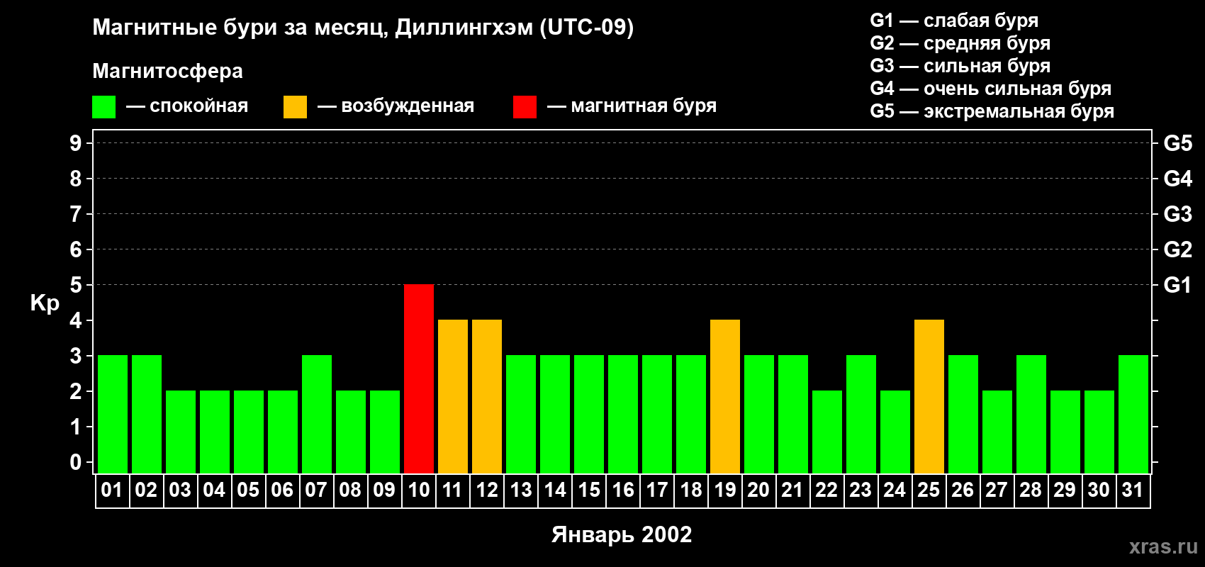 Изменения максимального суточного геомагнитного индекса Kp в январе 2002 года для средних широт