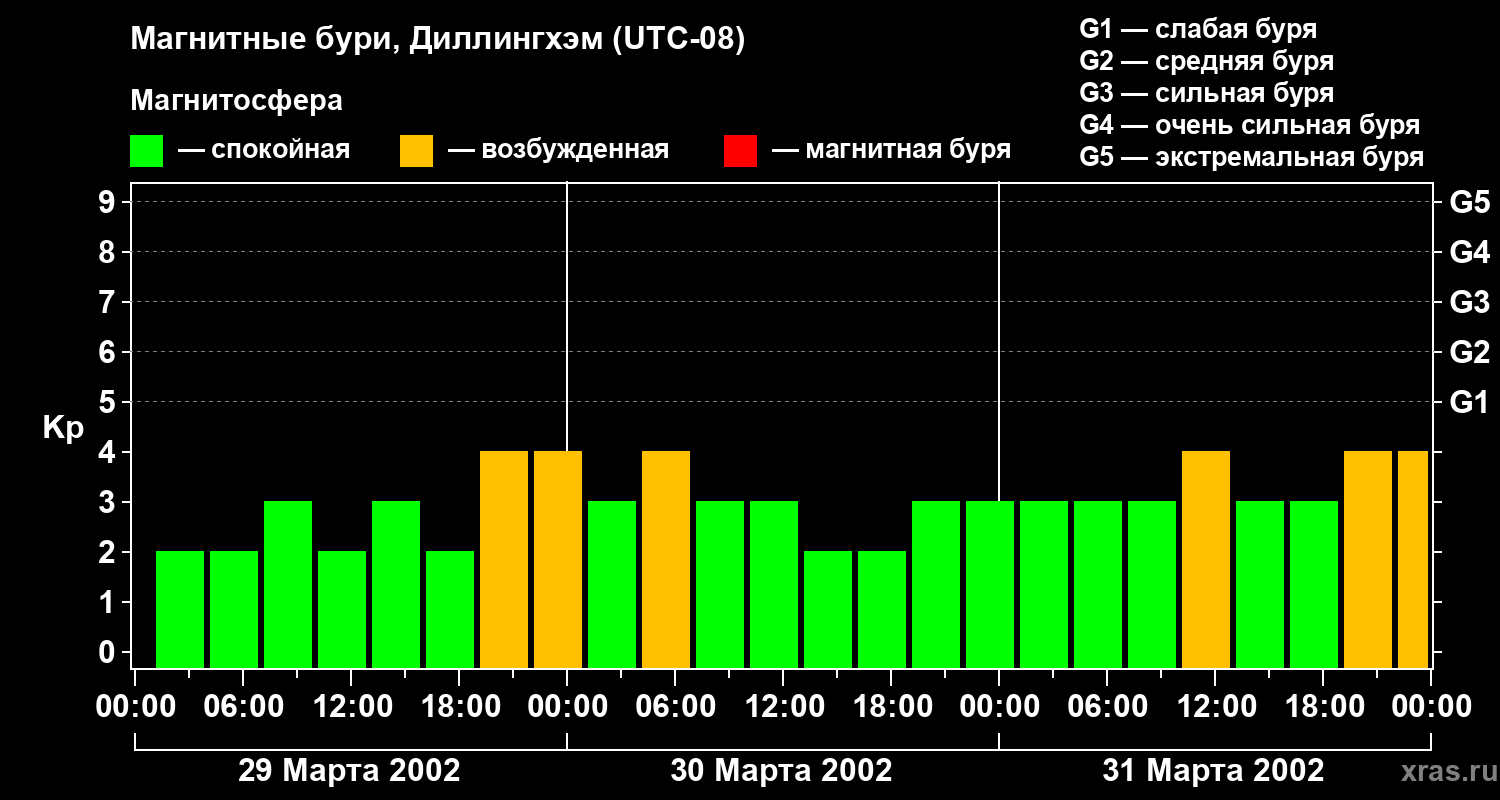 Изменения геомагнитного индекса Kp с 29 по 31 марта 2002 года для средних широт