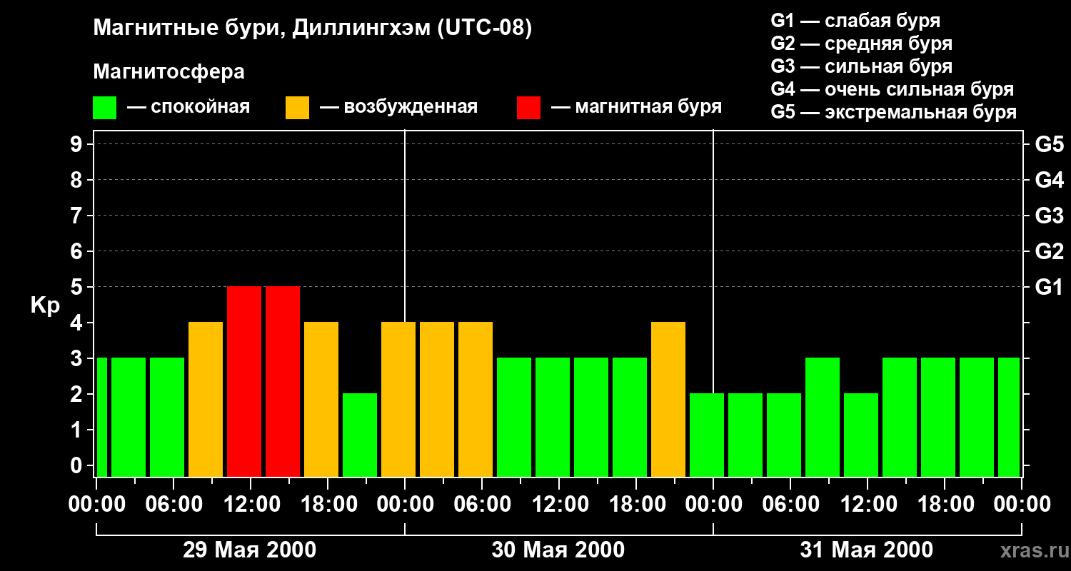 Изменения геомагнитного индекса Kp с 29 по 31 мая 2000 года для средних широт