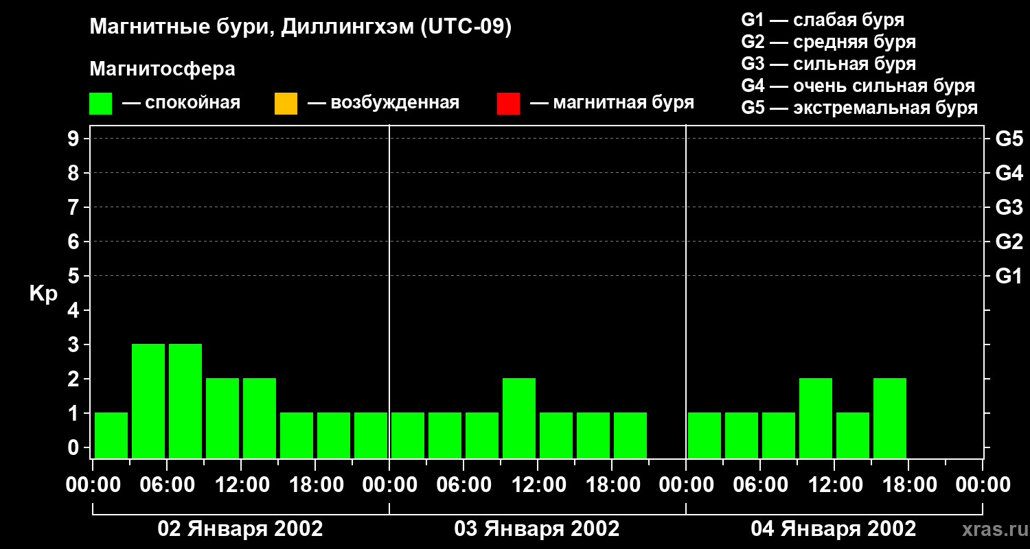 Изменения геомагнитного индекса Kp с 2 по 4 января 2002 года для средних широт