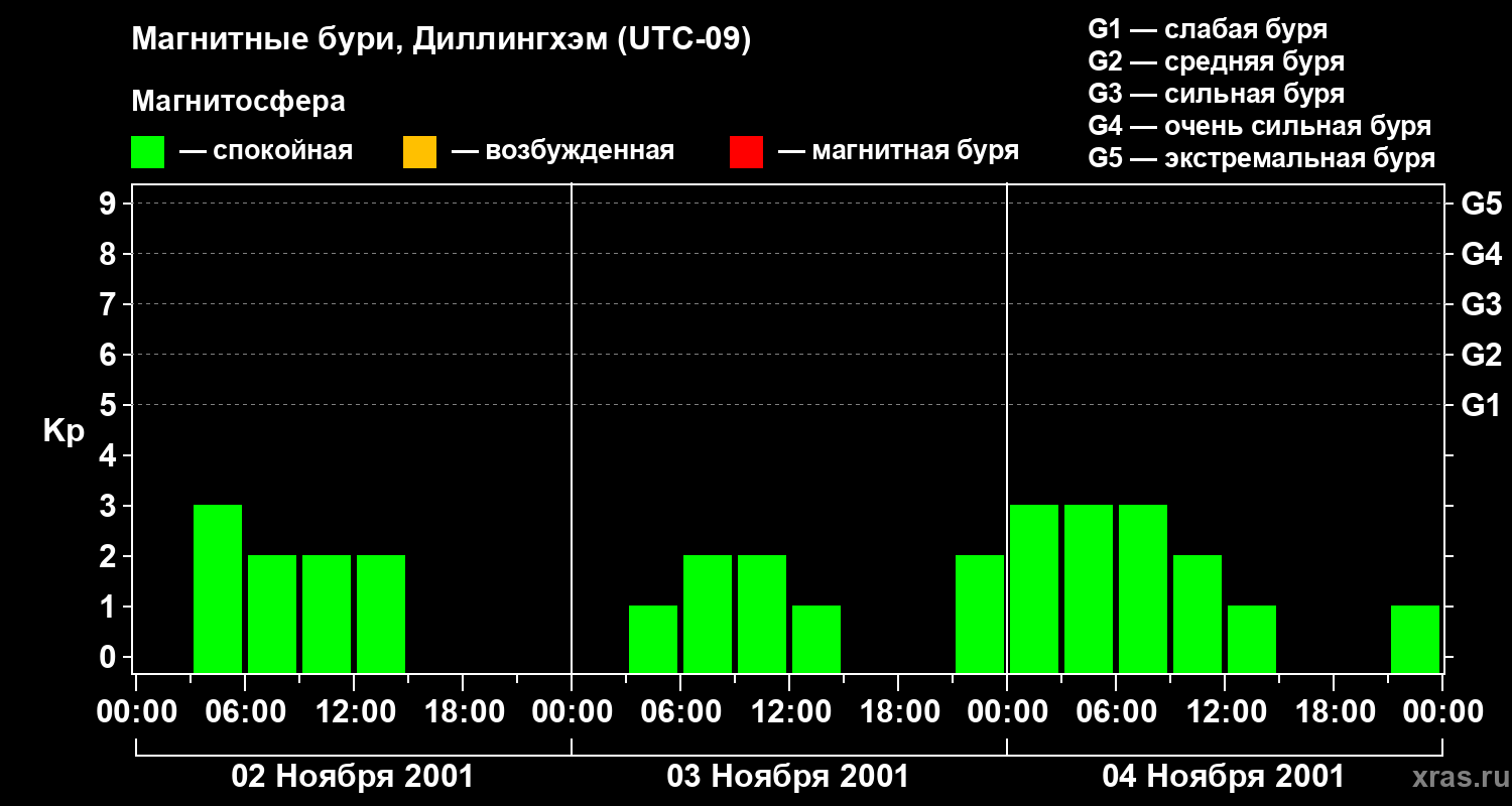 Изменения геомагнитного индекса Kp с 2 по 4 ноября 2001 года для средних широт