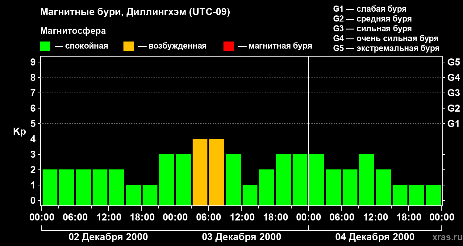 Изменения геомагнитного индекса Kp с 2 по 4 декабря 2000 года для средних широт
