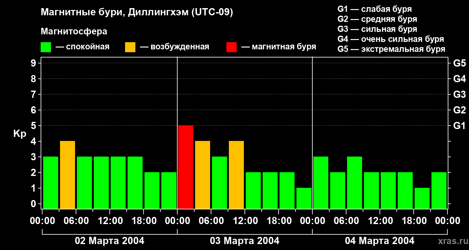 Изменения геомагнитного индекса Kp с 2 по 4 марта 2004 года для средних широт