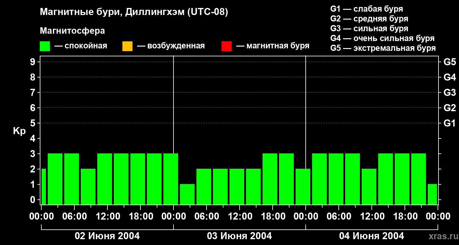 Изменения геомагнитного индекса Kp с 2 по 4 июня 2004 года для средних широт