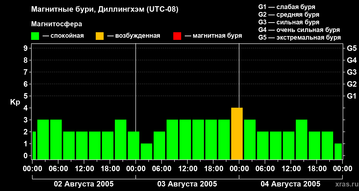 Изменения геомагнитного индекса Kp с 2 по 4 августа 2005 года для средних широт