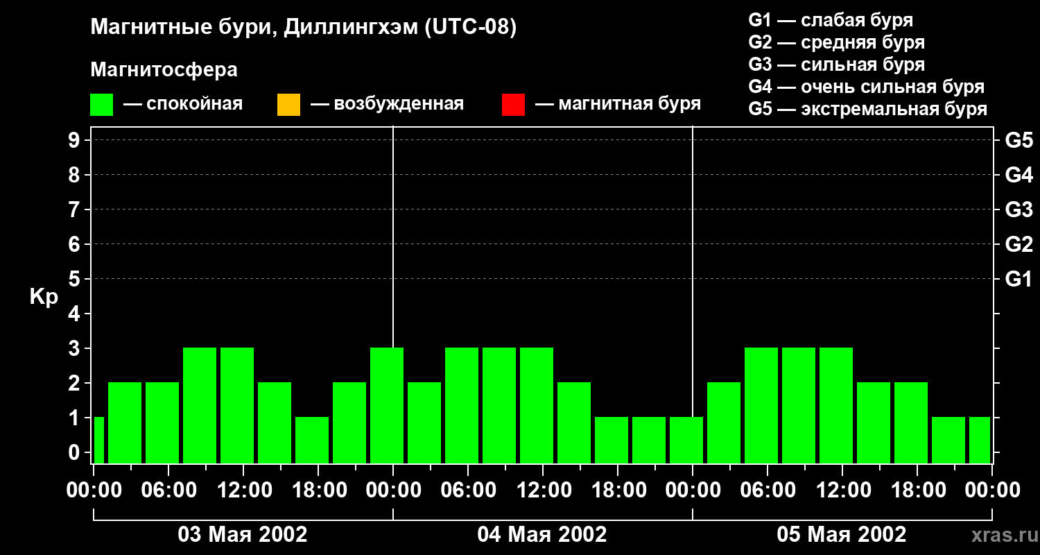 Изменения геомагнитного индекса Kp с 3 по 5 мая 2002 года для средних широт