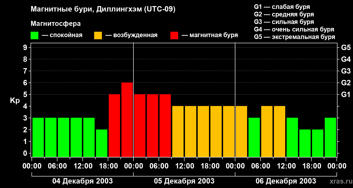 Изменения геомагнитного индекса Kp с 4 по 6 декабря 2003 года для средних широт