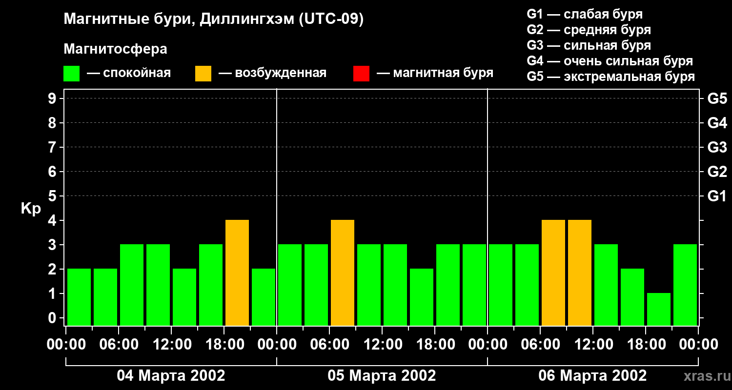 Изменения геомагнитного индекса Kp с 4 по 6 марта 2002 года для средних широт