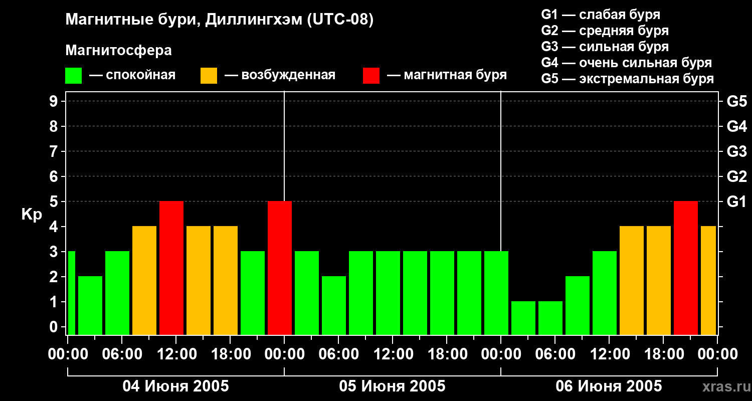 Изменения геомагнитного индекса Kp с 4 по 6 июня 2005 года для средних широт