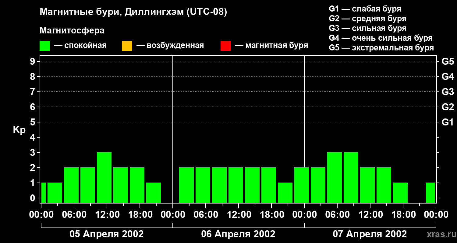 Изменения геомагнитного индекса Kp с 5 по 7 апреля 2002 года для средних широт