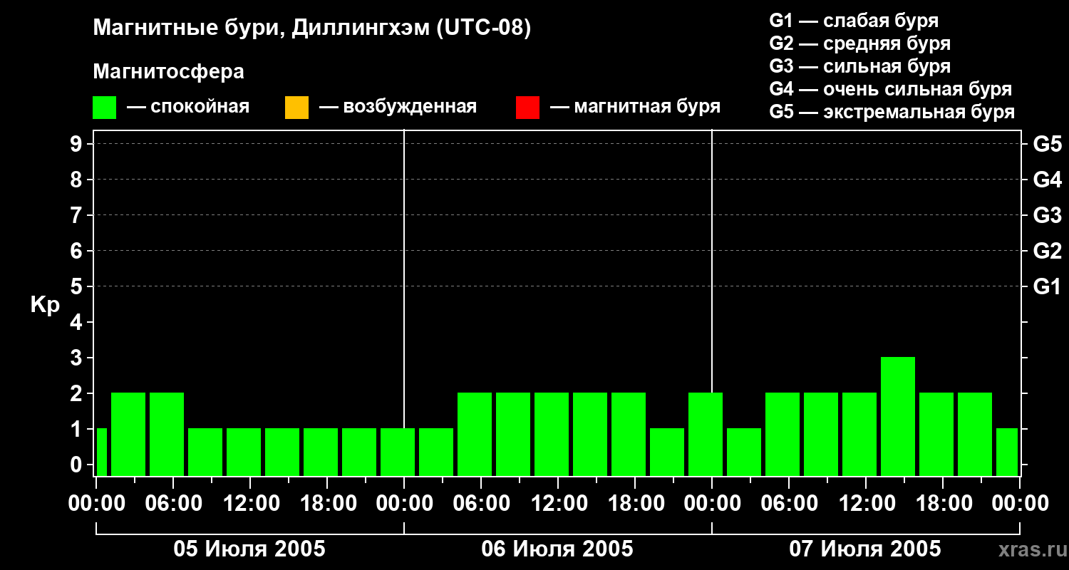 Изменения геомагнитного индекса Kp с 5 по 7 июля 2005 года для средних широт