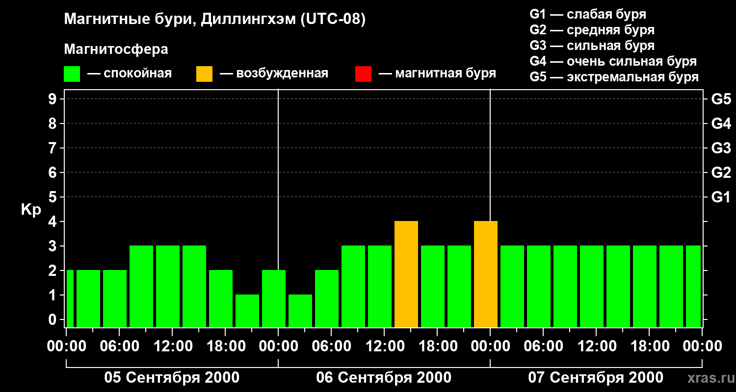 Изменения геомагнитного индекса Kp с 5 по 7 сентября 2000 года для средних широт