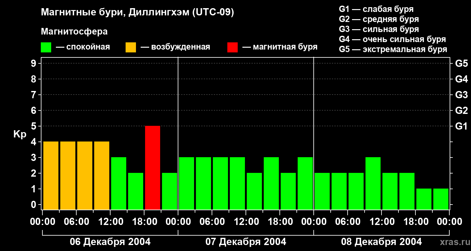 Изменения геомагнитного индекса Kp с 6 по 8 декабря 2004 года для средних широт