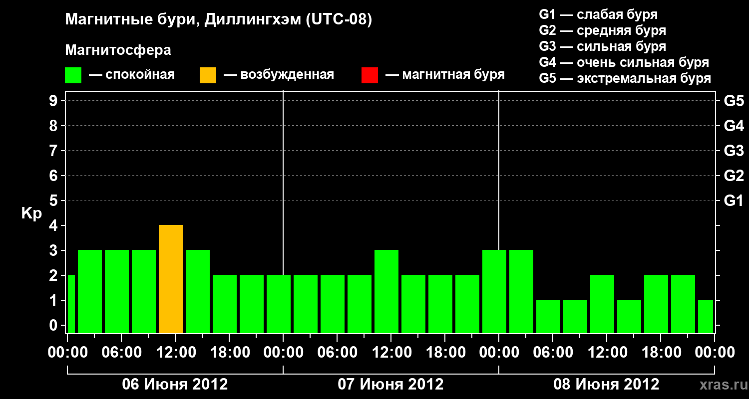 Изменения геомагнитного индекса Kp с 6 по 8 июня 2012 года для средних широт