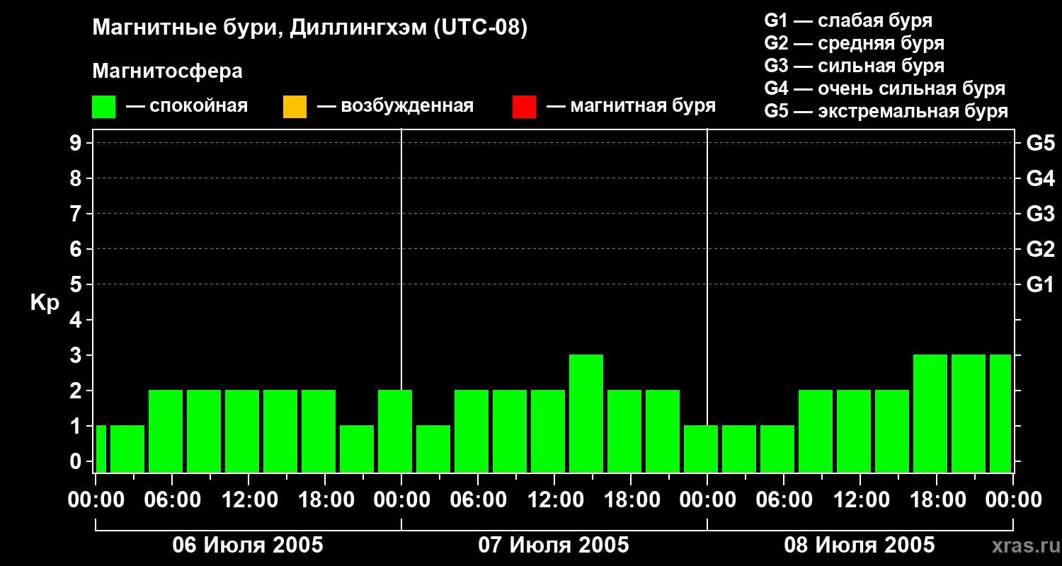 Изменения геомагнитного индекса Kp с 6 по 8 июля 2005 года для средних широт