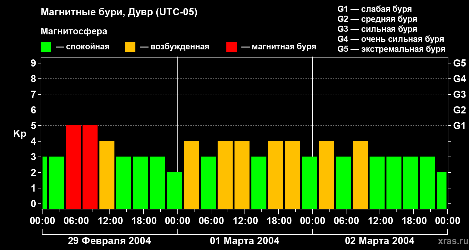 Изменения геомагнитного индекса Kp с 29 февраля по 2 марта 2004 года для средних широт