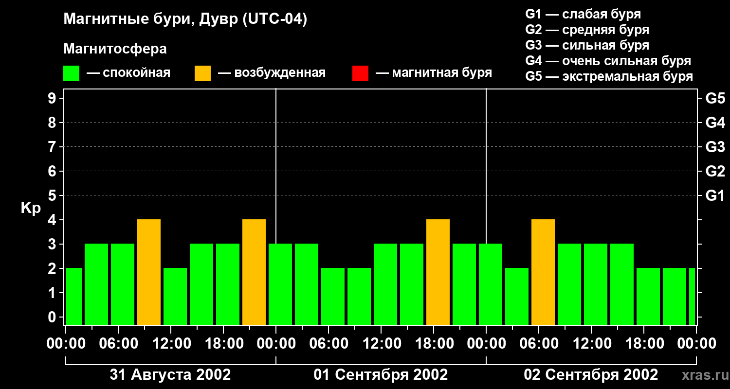 Изменения геомагнитного индекса Kp с 31 августа по 2 сентября 2002 года для средних широт