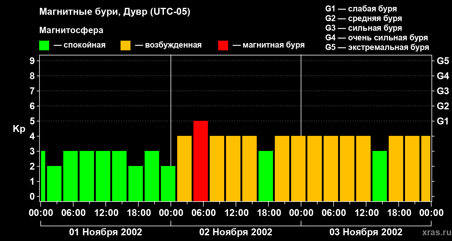 Изменения геомагнитного индекса Kp с 1 по 3 ноября 2002 года для средних широт