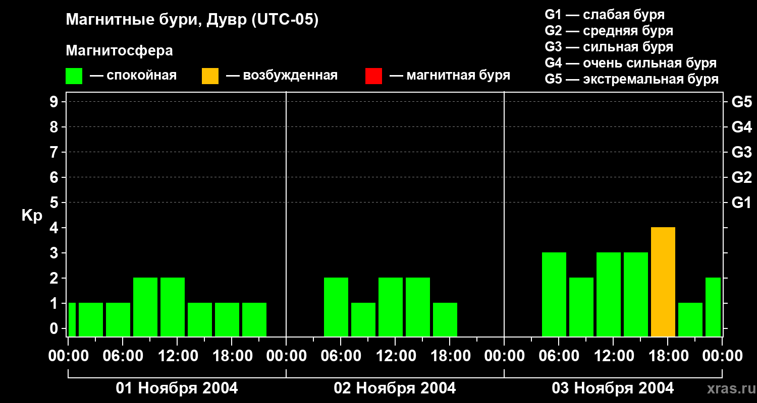 Изменения геомагнитного индекса Kp с 1 по 3 ноября 2004 года для средних широт