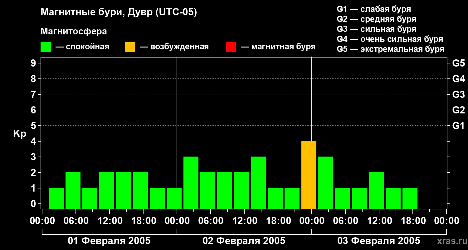 Изменения геомагнитного индекса Kp с 1 по 3 февраля 2005 года для средних широт