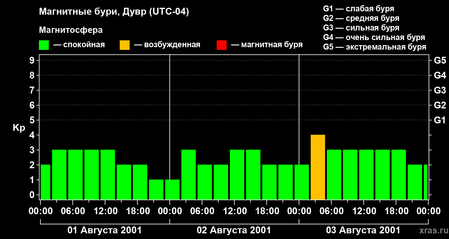 Изменения геомагнитного индекса Kp с 1 по 3 августа 2001 года для средних широт