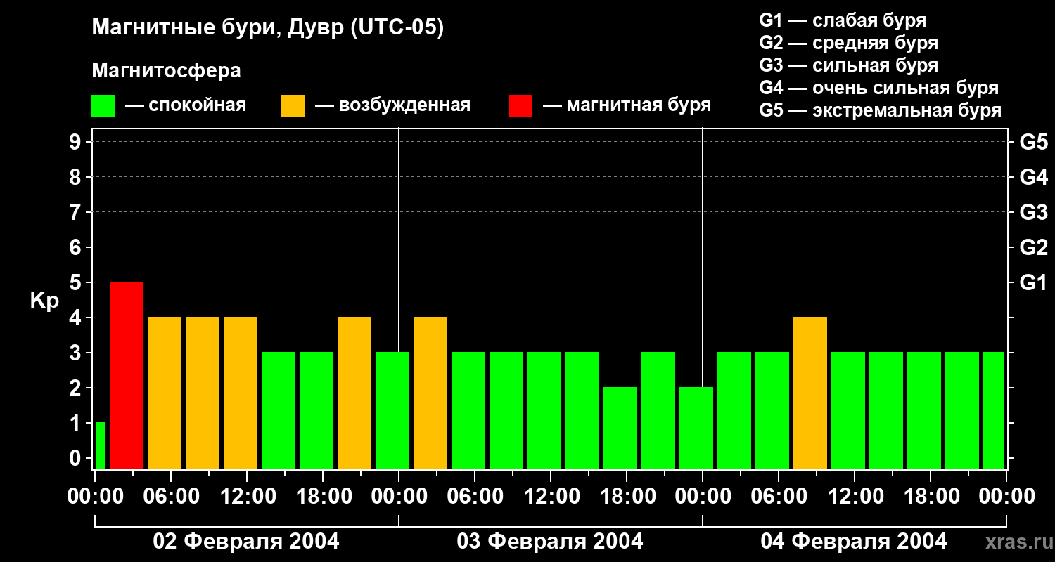 Изменения геомагнитного индекса Kp с 2 по 4 февраля 2004 года для средних широт