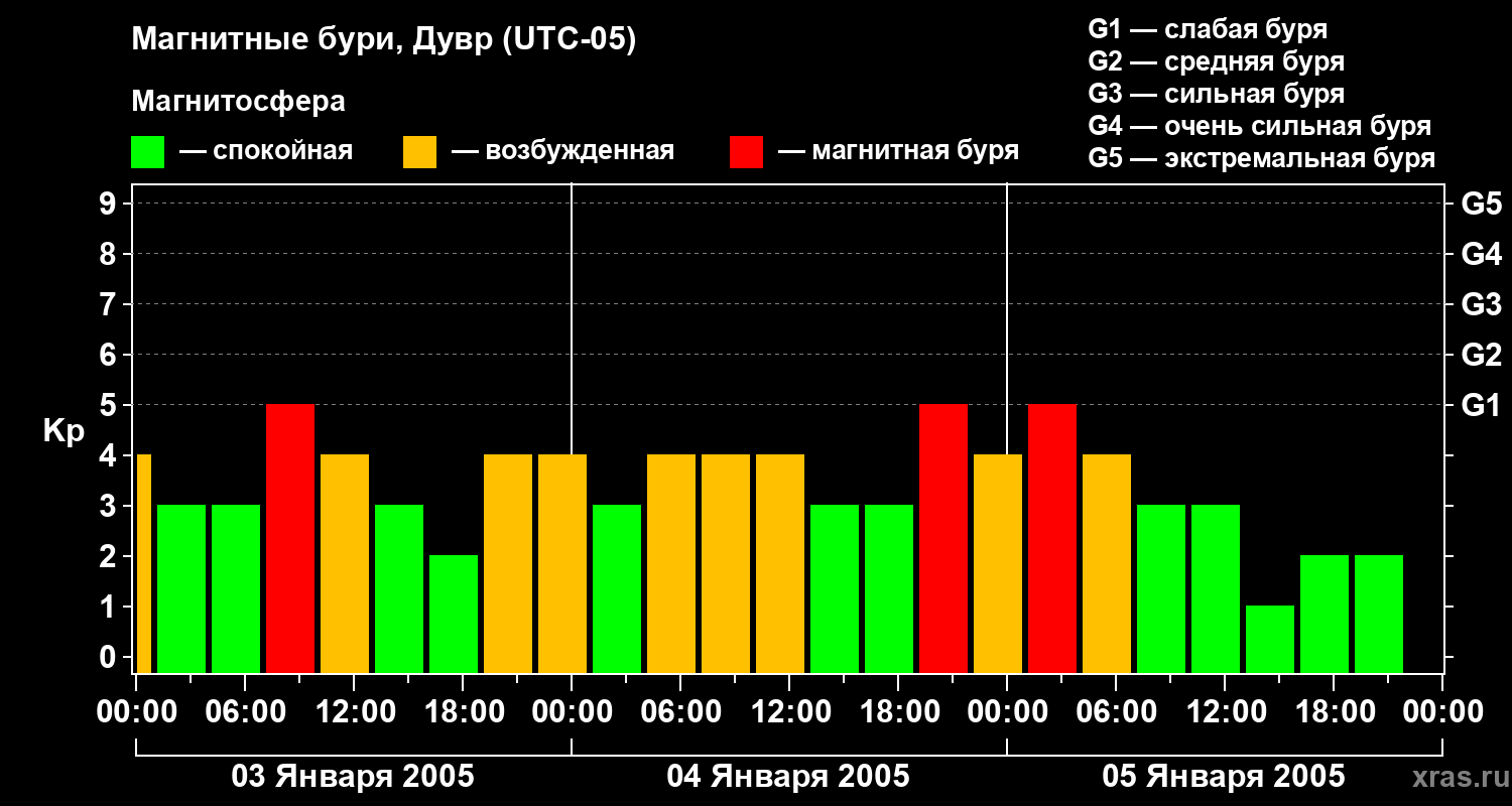 Изменения геомагнитного индекса Kp с 3 по 5 января 2005 года для средних широт