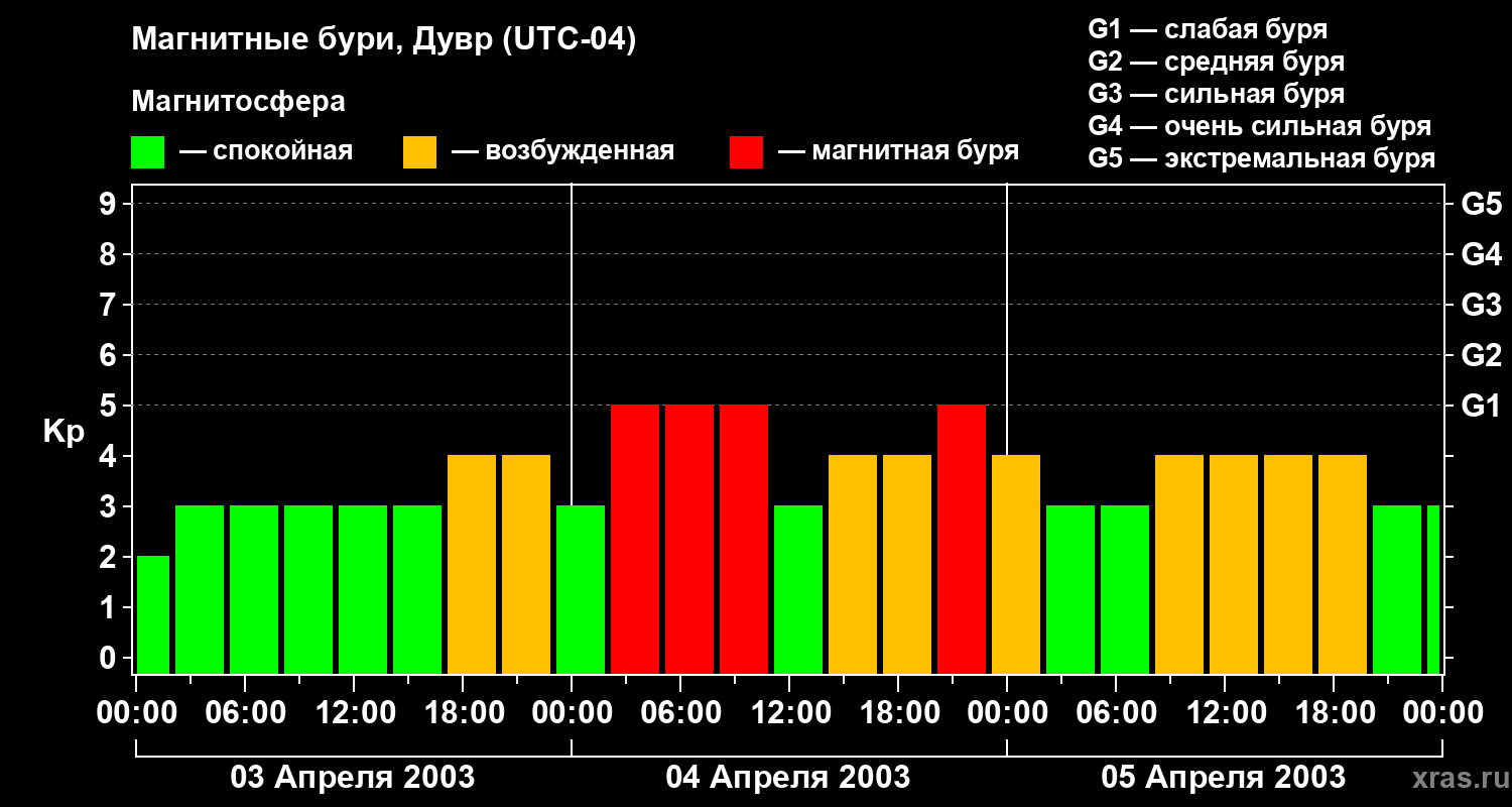 Изменения геомагнитного индекса Kp с 3 по 5 апреля 2003 года для средних широт
