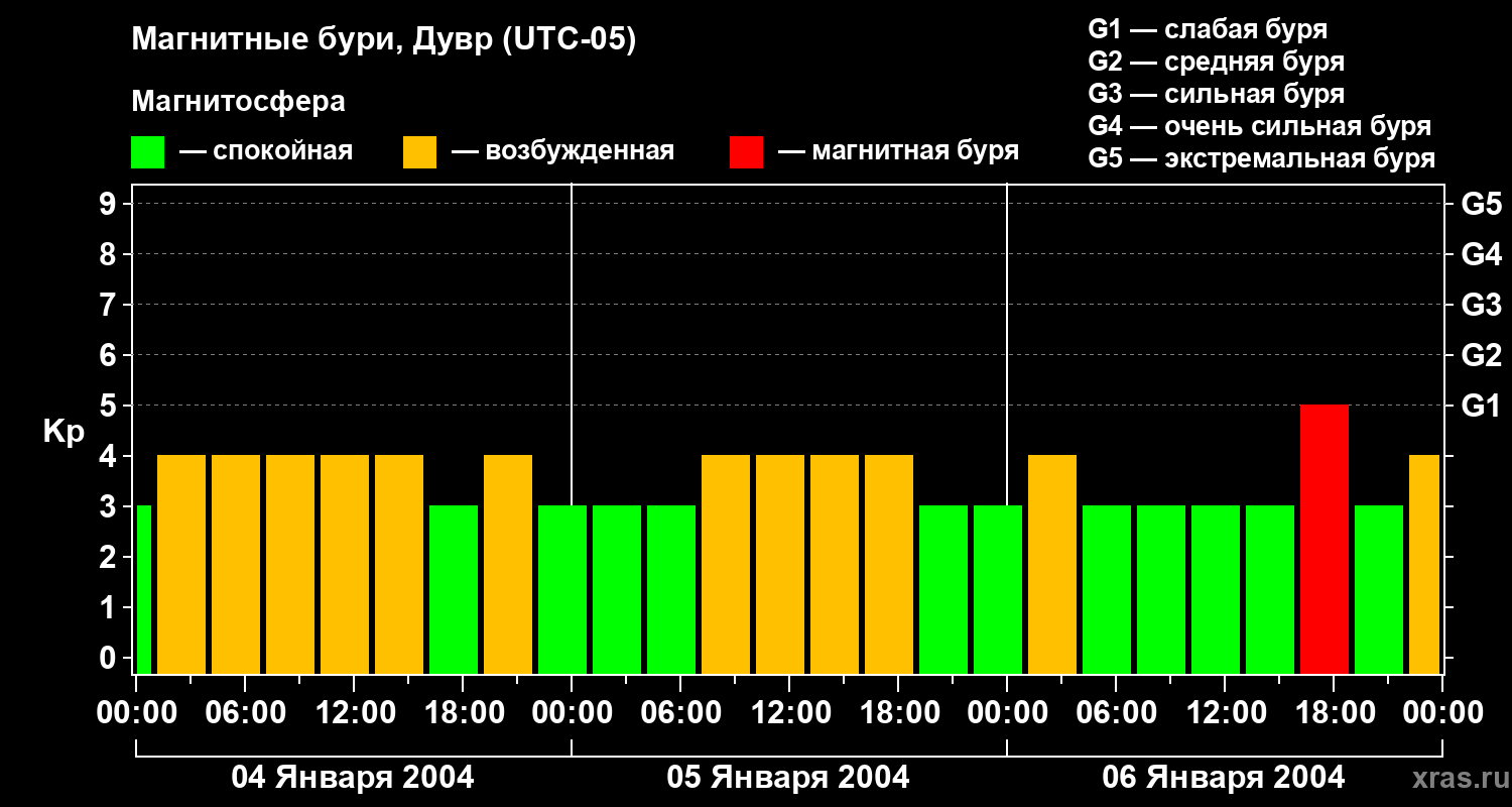 Изменения геомагнитного индекса Kp с 4 по 6 января 2004 года для средних широт