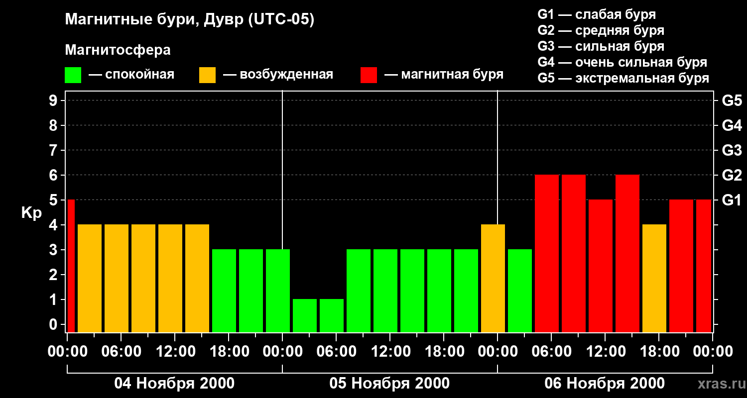 Изменения геомагнитного индекса Kp с 4 по 6 ноября 2000 года для средних широт
