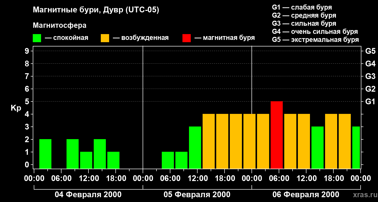 Изменения геомагнитного индекса Kp с 4 по 6 февраля 2000 года для средних широт